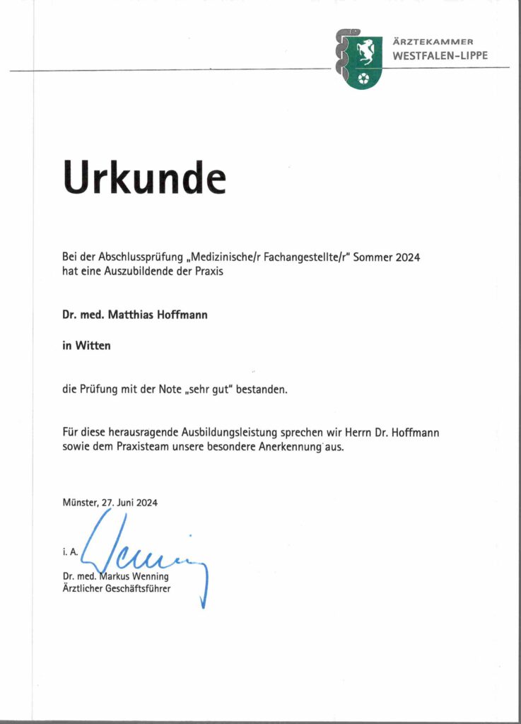 das Abschlussexamen der Ärztekammer Westfalen-Lippe erfolgreich absolviert.